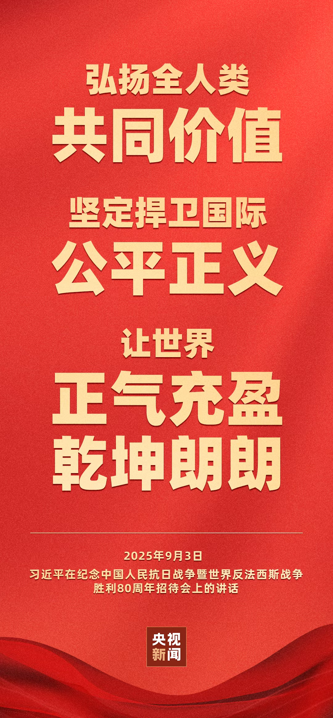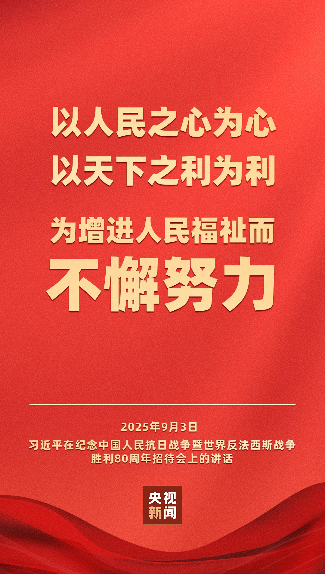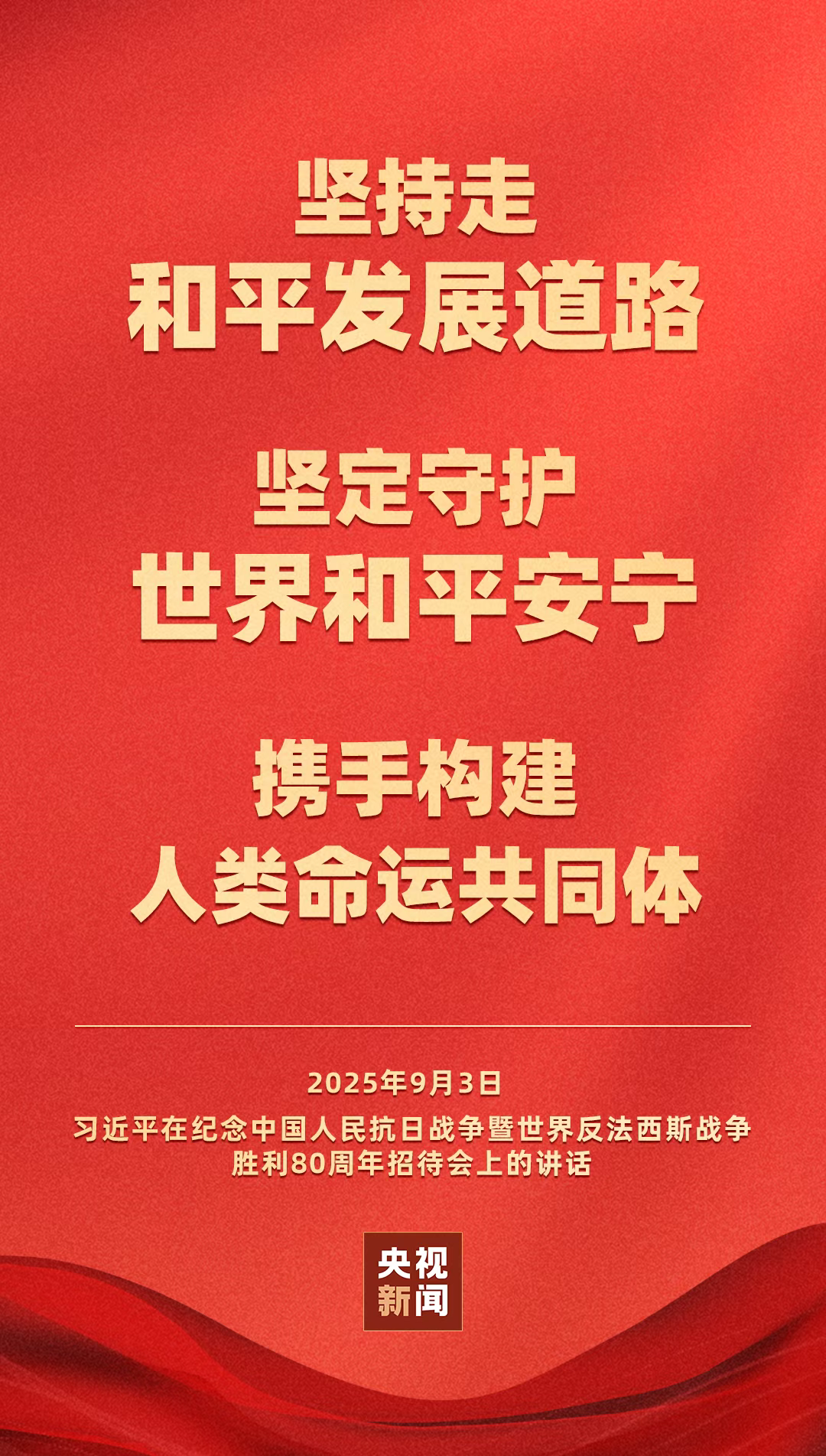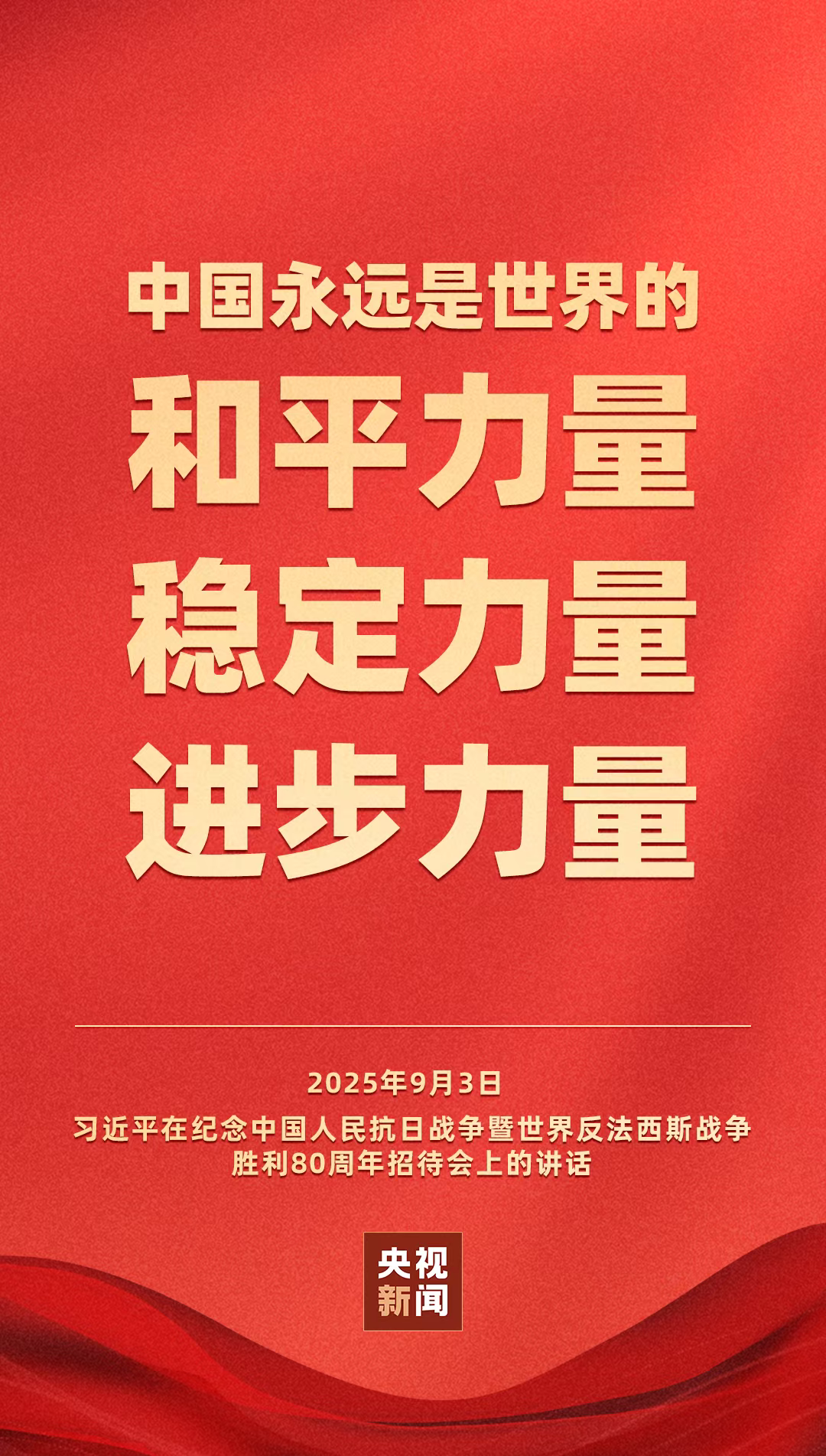 今天上午,我们举行盛大阅兵仪式,隆重纪念中国人民抗日战争暨世界反法西斯战争胜利80周年,目的是铭记历史、缅怀先烈、珍爱和平、开创未来。